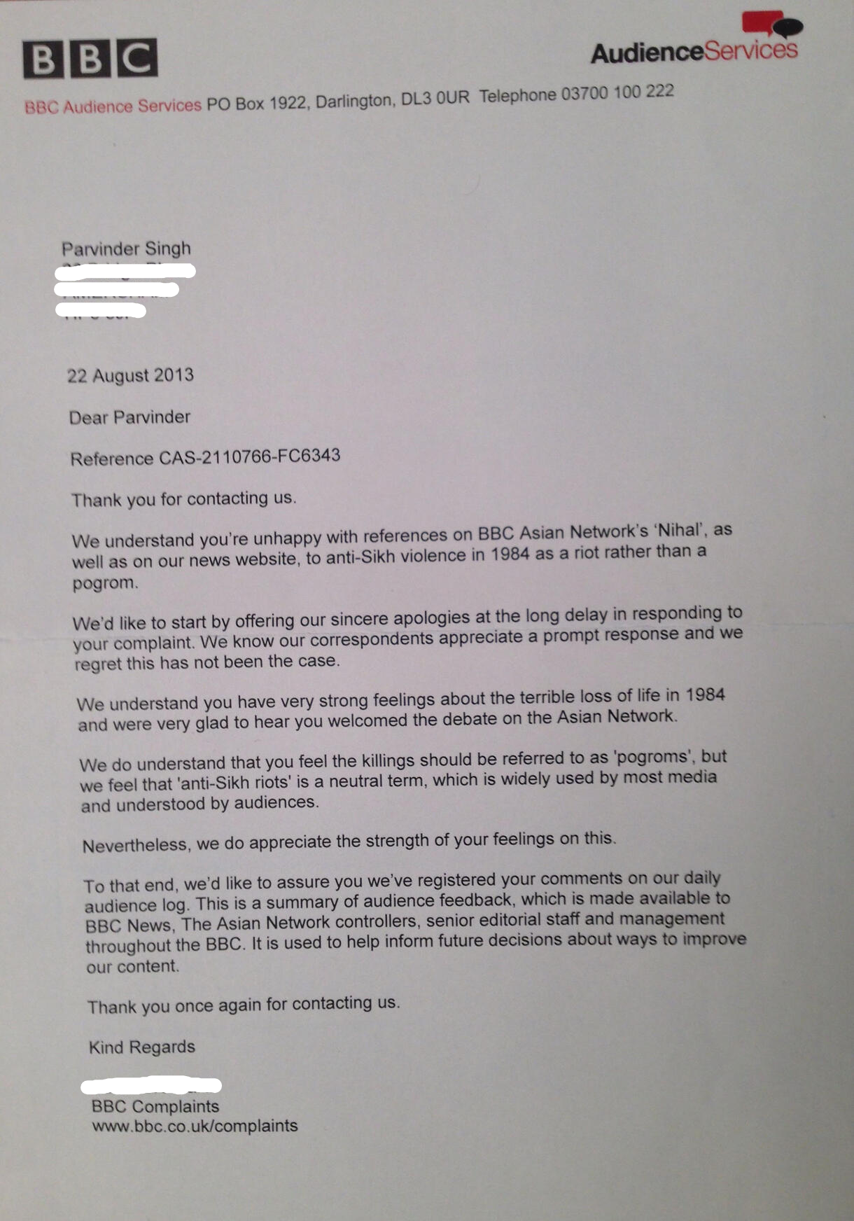 Letter to the BBC questioning the use of the term ‘anti-Sikh riot’ to describe the pogroms of 1984.