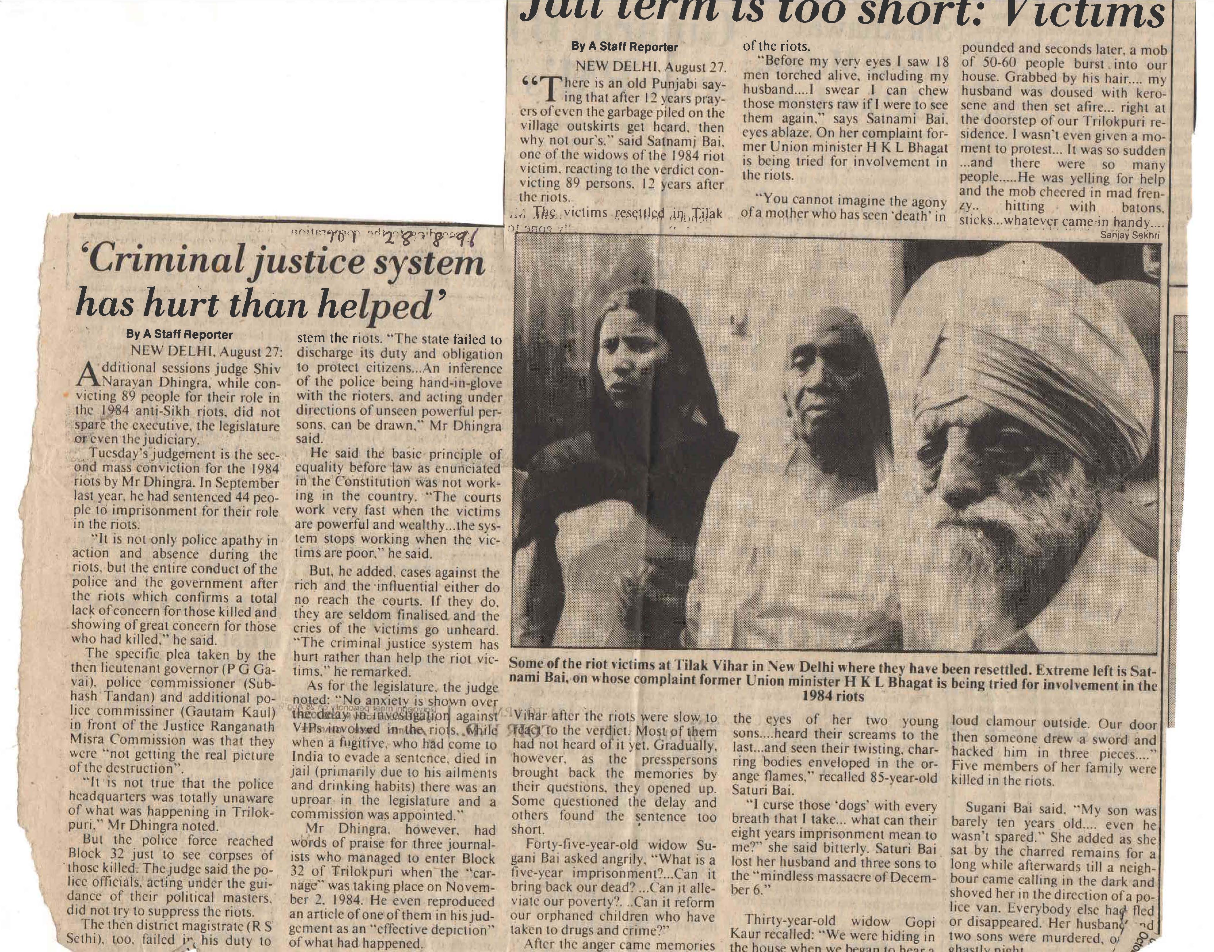 There was no sense of human dignity, no sense of compassion. What role did these girls have in Mrs Gandhi’s assassination? Were we all responsible? Sardaron ke bachche hai, tho marao (They are children of sardars, so kill them).”